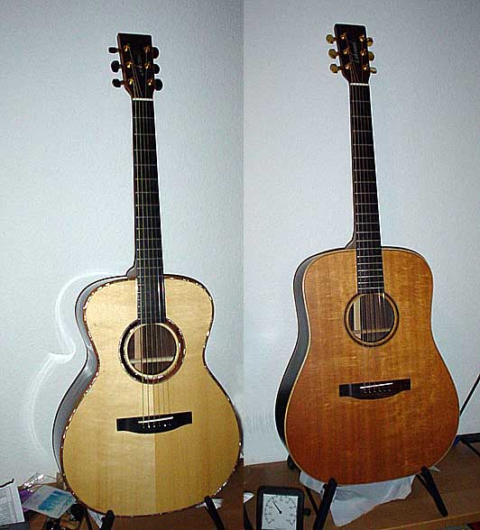 Links eine Lakewood M54. Deutsche Fichte, Riopalisander, Ebenholz, Perlmutt. Ein Instrument ohne Fehl und Tadel, aber vom Ton nicht mein Fall, ich bin einfach zu 100 Prozent auf Dreadnoughts fixiert. Rechts eine Lakewood D32, wie sie früher ausgeführt worden sind. Eine unheimlich orangefarbene Decke aus Sitka, Korpus aus indischem Palisander, seidenmatte Lackierung aus Nitrolack, X nicht scallopiert. Die hätte ich behalten sollen. Die war klasse und ich ein Trottel, daß ich sie verkauft habe.